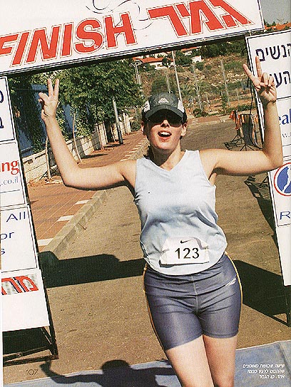 רגע, משהו פה משונה. מישהי רצה בכיוון ההפוך, מקו הסיום אלי. מה, בא לה עוד סיבוב? הי, זאת גבי, גיסתי. "לי-לך! אל תפסיקי", היא צועקת. אני מגבירה את הקצב. קו הסיום מתקרב. "לי-לך, תביאי אותה בספרינט!" זועקת גבי. והנה, כבר אני עוברת את קו הסיום.