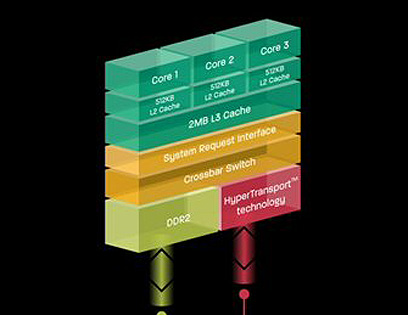 באדום: Hyper Transport 3.0, בירוק-זית: בקר הזיכרון המובנה. תרשים: AMD