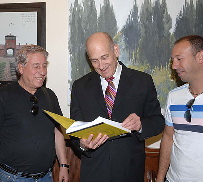 שמוליק ואברהם לוי עם אולמרט והספר הבית"רי (צילום: משה מילנר, לע"ם)