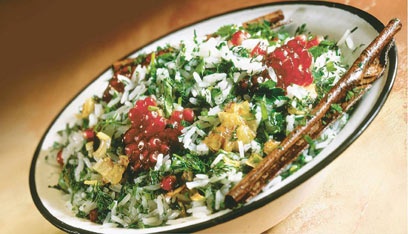 אורז עם עשבי תיבול, בצל מטוגן ורימונים