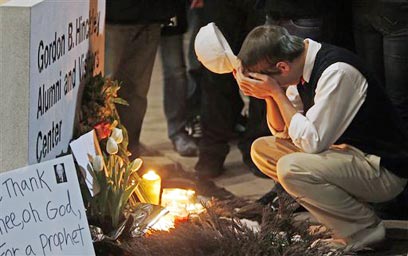 מתפללים לשלומו של הינקלי במדינת יוטה, אתמול (צילום: AP)