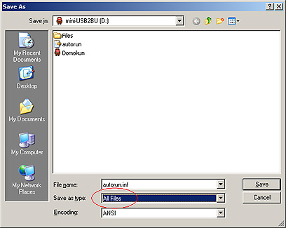 את domokun.ico אפשר להחליף בשם קובץ האייקון שבחרתם. כששומרים את הקובץ על ההתקן הנייד, יש לוודא שהוא נשמר כ-All Files (כל הקבצים) ולא כ-txt. את הסיומת הנכונה, inf, מקלידים בשדה של שם הקובץ, כפי שרואים בדוגמה הבאה: