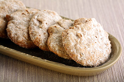 4. משמנים בנדיבות תבנית אפיה, מערבבים יחדיו את שארית הסוכר עם קמח המצה ומפזרים בנדיבות על תבנית האפייה המשומנת. מחלקים כ-26 מנות עוגייה על התבנית וצרים מעוינים בידיים משומנות, אופים ב- 150 מעלות לרבע שעה, מוציאים מהתנור ובוזקים מעל מעט אבקת סוכר.