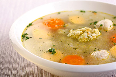 2. מרתיחים את מרק העוף ומוסיפים אליו את האורז, קציצות העוף וחלמוני הביצה. מכסים את הסיר, מנמיכים את האש ומבשלים ל-20 דקות.