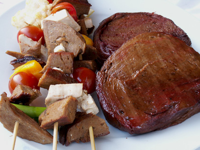 ניתן לשלב בשיפודי הירקות גם תחליפי בשר מהצומח. מומלץ להשרות לילה קודם במרינדה הכוללת רוטב סויה, שום, מעט סוכר, דבש, מולסה או סירופ מייפל אמיתי ותערובת תיבול לברביקיו. למוצרים שאינם מכילים שומן (כמו טופו וסייטן) רצוי להוסיף גם שמן זית, לשיפור הצלייה. דוגמאות לאלטרנטיבות: טופו, טמפה (קונים קפוא) וסייטן, הקרוב ביותר לבשר מבחינת מרקם וטעם ועשוי מחיטה מלאה. ישנם המבורגרים טעימים מאוד מהצומח, תוצרת "טבע דלי", העשויים מקינואה, עדשים מונבטים, צנוברים, אורז מלא ושקדים. בנוסף תוכלו לרכוש "בורגר קינואה וכוסמין" ו"בורגר נוגד-חימצון", עשוי מפולי אזוקי.