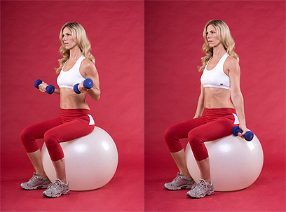 ועל אותו כדור, או על ספסל או כיסא, הרגליים בפישוק קל, הגו מוטה מעט לפנים.