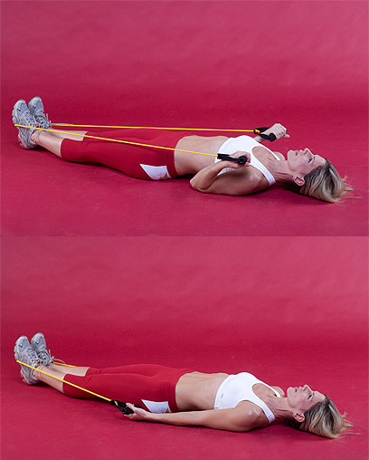 1. שכבי על הגב כשהרגליים צמודות. כרכי את הגומייה סביב כפות הרגליים ואחזי בכל יד בקצה של הגומייה, המרפקים צמודים לגוף.