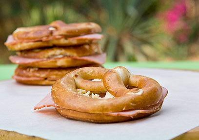 - פרעצל מרוח בחמאה וחרדל, עם שינקן וגבינת צ'דר מיושנת.