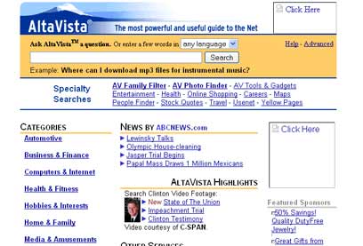 AltaVista, שנולד בתחילת 1996, היה מנוע חיפוש מצויין לזמנו. לראייה, כבר בימים הראשונים הוא הפך לספק החיפוש הבלעדי של Yahoo. שלוש שנים לאחר מכן