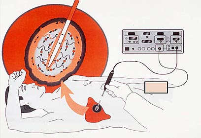 הצגת הטכניקה של טיפול באמצעות RF Ablation: הכנסת אלקטרודה לתוך גידול בכבד, הפעלת אנרגיה המחממת וצורבת את הגידול.