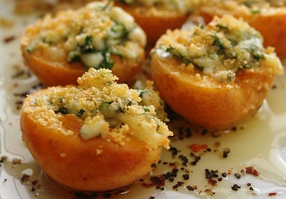 3. ממלאים את המשמשים בתערובת הגבינות ומפזרים מעליהם את פירורי הלחם. אופים ב-200 מעלות בתנור במשך כ-6 דקות.
