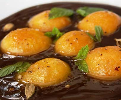 משמשים בקרמל ותבלינים, עם גאנש שוקולד והל