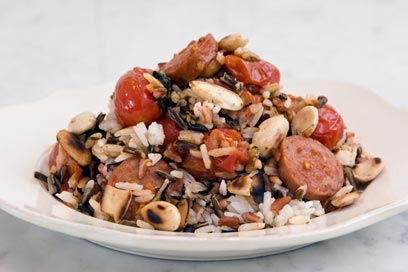 8. מערבבים את תערובת האורז עם הצ'וריסוס הצלויים, העגבניות והשום. טועמים ומתקנים תיבול במידת הצורך. מגישים חם. אפשר לעטר בשקדים חצויים קלויים.
