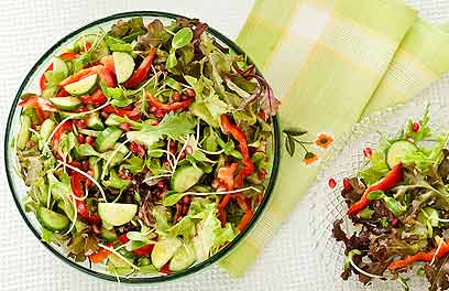2. מערבבים בקערת הגשה גדולה ונאה עלי בייבי, פלפלים, מלפפונים, בצל סגול, נבטוטי חמניות ורימונים.