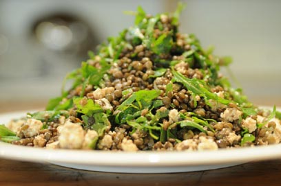 - מניחים בקערה את העדשים, מפוררים פנימה את הריקוטה, מוסיפים את עלי הרוקט ומתבלים בשמן זית, חומץ בלסמי, מלח ופלפל. מערבבים היטב