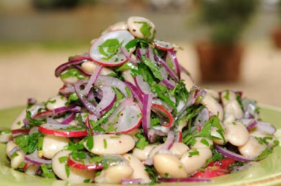 סלט שעועית לבנה עם בצל סגול, צנונית, פטרוזיליה וגרידת לימון