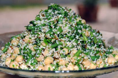 סלט חומוס, בורגול, שעועית ירוקה, בצל מטוגן וקימל