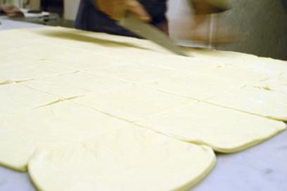 - מרדדים את הבצק לעלה דק. חותכים בעזרת סכין למלבנים בגודל 6X4 ס"מ (או באורך כפול, אם רוצים).
