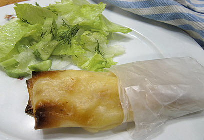 4. בעזרת מברשת מושחים את עלה הסיגר בשמן זית, משני צדדיו. מניחים כמות השווה לכ-2 כפות גדושות מהמלית, במרכז העלה. מקפלים את שני צידי העלה למרכז, מעל המלית ומגלגלים לקבלת בלינצ'ס, צר וארוך. מניחים על תבנית מרופדת בנייר אפיה.