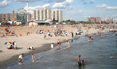 בקיץ המוני אנשים מגיעים לחוף להשתזף. קוני איילנד (צילום: ג'נביב לונג בלמקר)