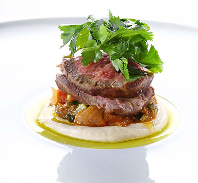 נתחי עגל צרובים, עם תבשיל ירקות וטחינה. מאיר אדוני מציג (צילומים: דן פרץ)