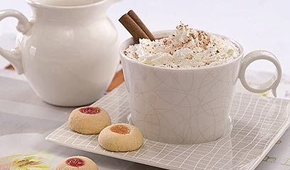 • מוזגים לספלים, מזליפים או מניחים בכפות את הקצפת מעל המשקה ואם רוצים, מפזרים מעל את הקינמון והמוסקט. מגישים.