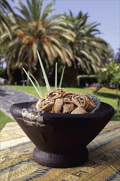 .3 מקמחים קלות משטח עבודה ומפזרים עליו את השומשום. מרדדים כל כדור בצק לעלה בגודל 30X25 ס"מ. משאירים 2 ס"מ מחלקו העליון של כל עלה כשוליים, ועל שאר השטח מורחים בנדיבות רבע מכמות ממרח התמרים ומפזרים עליו רבע מכמות האגוזים. מגלגלים כל עלה לצורת גליל, מתחילים בצלע הקרובה אלינו ומגלגלים לכיוון הצלע שנותרה נקייה.