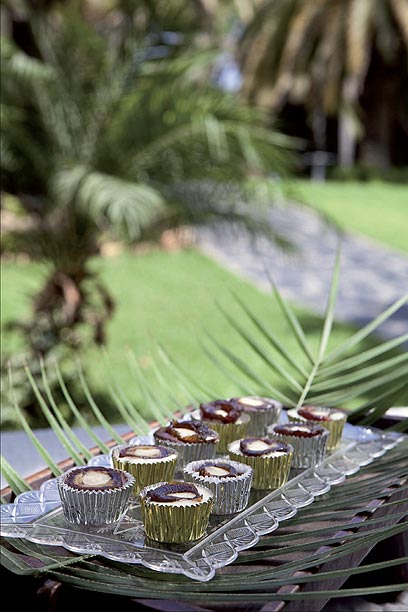 4. מוציאים מהתנור ומניחים בכל עטרת נייר חצי תמר, כשהחלק החתוך פונה כלפי מעלה. מאחסצ נים את מגש הפטיפורים במקרר, עד שהשוקולד מתקשה. מגישים.