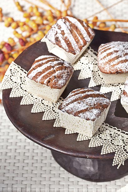 .3 שמים בקערה נפרדת את הקמח, המלח ואבקת האפייה ומערבבים. מוסיפים לקערת המערבל את תערובת הקמח ואת המים לסירוגין ומערבבים בתנועות קיפול עדינות. מוסיפים לעיסה את התמרים ואת השוקולד הקצוץ ומערבבים בתנועות קיפול עדינות. מעבירים לתבניות (או לתבנית השקעים) ואופים כ- דקות, או עד שקיסם הננעץ במרכז העוגה יוצא נקי. מוציאים, מצננים, מקשטים באבקת סוכר ומגישים.