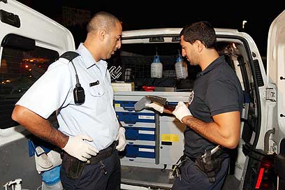 חוקרי המשטרה בודקים את הסכין שנמצאה בשטח (טל שחר)