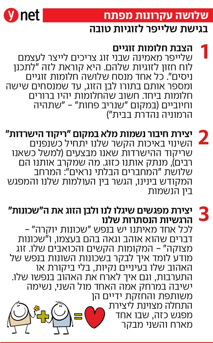 "יש הבדל בין סתם להתקיים יחד באותו הבית כבעל ואישה", שלייפר אומרת, "ובין באמת לחיות ביחד בצורה מלאה ולהרגיש את האהבה ביניכם כל יום מחדש". ובאמת, גם זוגות טובים ואוהבים מתקשים לפעמים להרגיש את החיבור הנשמתי והחזק שיש ביניהם כשהם חיים במשך שנים באותה דירה ממושכנת. הנה, רק לפני כמה ימים רן אמר לי "את יודעת שכבר מלא זמן לא ראיתי את העיניים שלך". "מה אתה מדבר", אמרתי לו, "אני מסתכלת עליך כל הזמן". "את לא מבינה", הוא אמר, "המבט שלך בכלל לא נח עליי, הוא חולף דרכי".