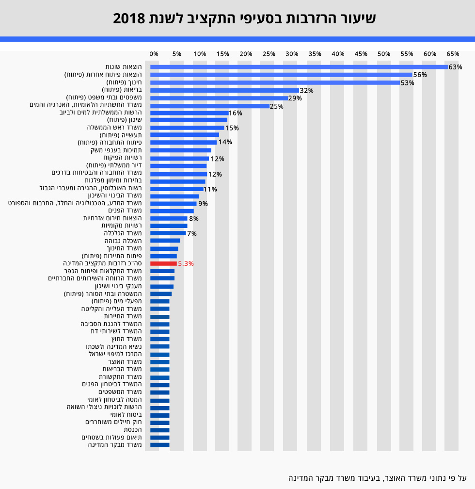 הביקורת העלתה כי ב-2018 כ-43% מתקציב הפיתוח של משרד החינוך, כ-32% מתקציב הפיתוח של משרד הבריאות וכ-28% מתקציב הפיתוח של משרד המשפטים ובתי המשפט היוו רזרבות שלא היו גלויות לכנסת בשלב אישור התקציב.