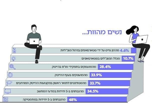 לפי הדוח, פערי השכר, הניהול והיזמות בין נשים וגברים "נותרו עמוקים בתוך ליבת ההייטק", אף שמספר הסטודנטיות למקצועות ההייטק גדל ב-116% בעשור האחרון, ומספר הנשים העוסקות במחקר ופיתוח (מו"פ) בתחום יותר מהוכפל.
