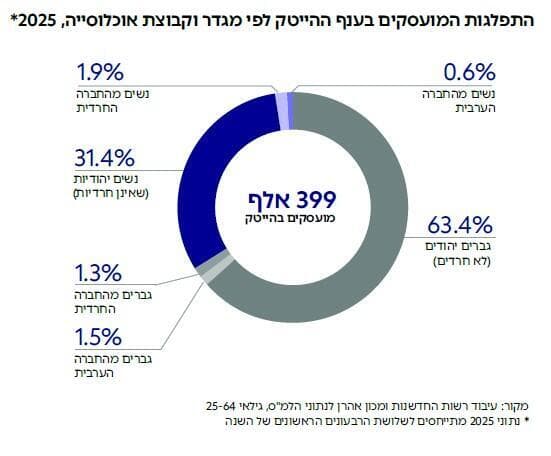 בשנת 2025, בהתבסס על נתוני שלושת הרבעונים הראשונים של השנה, הועסקו בענף ההייטק הישראלי כ-135 אלף נשים, שהן רק כשליש, 34%, מהמועסקים בענף. שיעור זה כמעט ולא השתנה בשלושת העשורים האחרונים. גם בעשור האחרון, על אף גידול מהיר במספר המועסקים בענף, חלקן היחסי של הנשים נותר כמעט ללא שינוי. בין השנים 2015 ו-2025 גדל אמנם מספר הנשים המועסקות בהייטק בכ-61%, אולם מספר הגברים גדל בקצב דומה, והפער היחסי לא הצטמצם. במקביל, לאחר עשור של עלייה הדרגתית, נבלם הגידול בחלקן של הנשים המועסקות בהייטק ביחס לכלל הנשים המועסקות במשק.