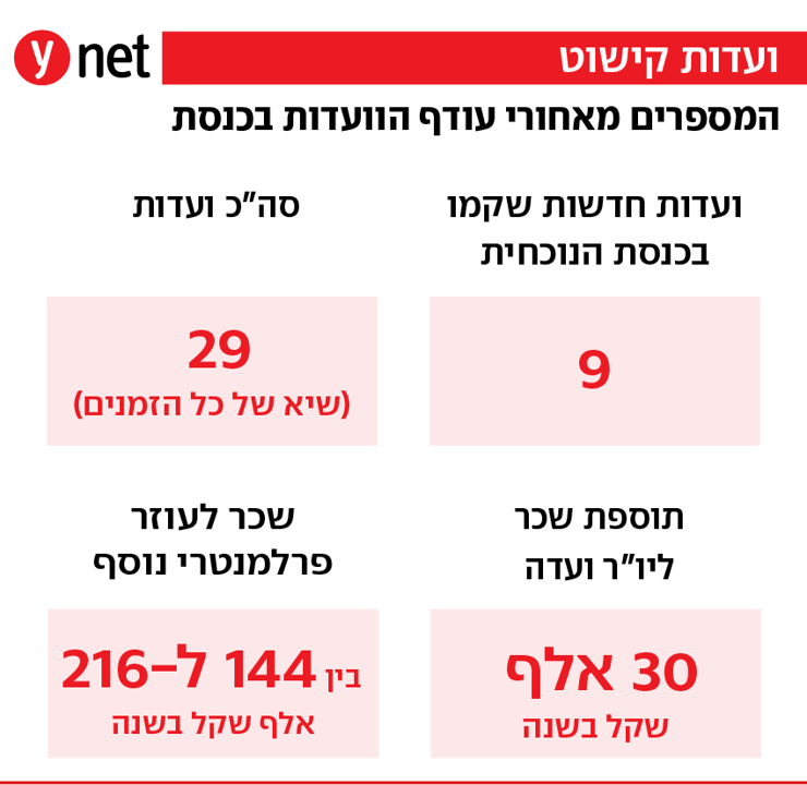 מבדיקת ynet ו"ממון" עולה כי בכנסת הנוכחית הוקמו תשע ועדות חדשות לגמרי, ועוד שתיים שהוקמו ופעלו חלקית בסוף הכנסת הקודמת, כאשר הקמתן מעוררות שאלות ובעיות רבות. המרכזית שבהן היא שבכנסת אין די חברים לאייש את כל הוועדות, כך שלישיבות רבות של מגיע רק יו"ר הוועדה, ולפעמים רק עוד ח"כ או שניים. בחלק מהוועדות, שמתכנסות רק לעתים - כך הודו חברי כנסת בשיחות עם ynet - אין בכלל צורך, "והן קיימות רק כדי להגדיל את הכבוד והשכר של חברי הכנסת שמכהנים כראשי הוועדות".