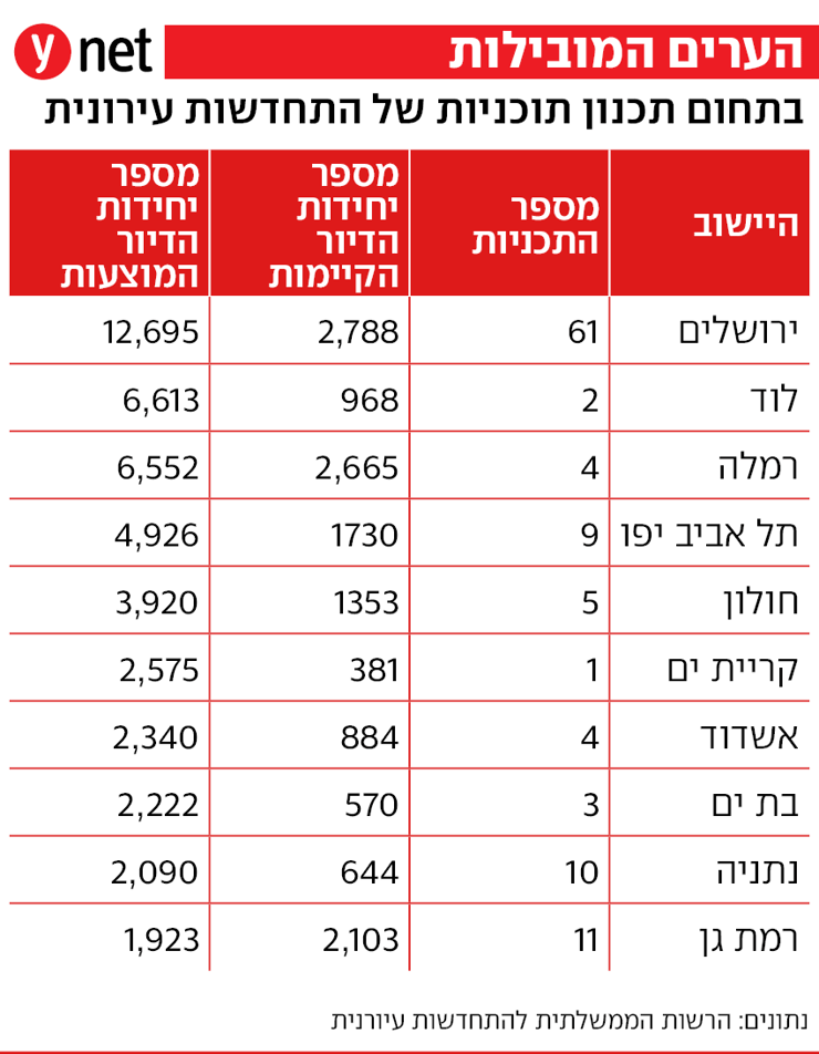 הערים המובילות בתחום התכנון של תוכניות התחדשות עירונית, לפי מספר יחידות הדיור המוצעות בתוכניות שאושרו במיזמי פינוי בינוי, הן ירושלים, לוד ורמלה. ירושלים בראש עם כמעט 13 אלף יחידות דיור חדשות, אחריה לוד עם 6,613 יחידות דיור מוצעות ורמלה עם 6,552 יחידות דיור מוצעות. רמלה היא גם העיר המובילה בהיקף יחידות דיור בתוכניות פינוי בינוי מאושרות ביחס לגודל האוכלוסייה, ואחריה לוד וקריית ים.