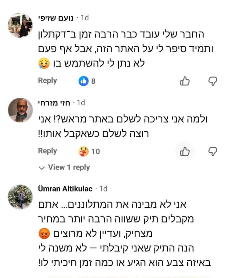 שני פרופילים אחרים בשם "רחמים" ו"דוד" כתבו אגב את אותה תגובה בדיוק: "למה אני צריכה לשלם באתר מראש?! אני רוצה לשלם, כשאקבל אותו!!".