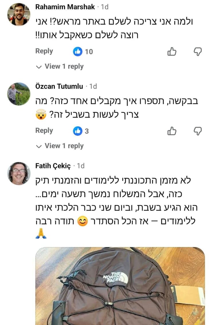 וישנן גם התגובות: "לא יכולנו להרשות לעצמנו לקנות תיק חדש לבן שלנו, אבל בזכותכם הוא כבר קיבל את ה-North Face החדש שלו. תודה רבה". את התגובה הזאת כתבה זיינפ דמיר, שם ישראלי טיפוסי. חנגיז אקורט, עוד שם ישראלי נפוץ כותב: "קיבלתי תיק כזה, אבל אף אחד לא האמין לי ששילמתי עליו רק 7.99 שקלים". אלה פרופילים מזויפים כמובן.
