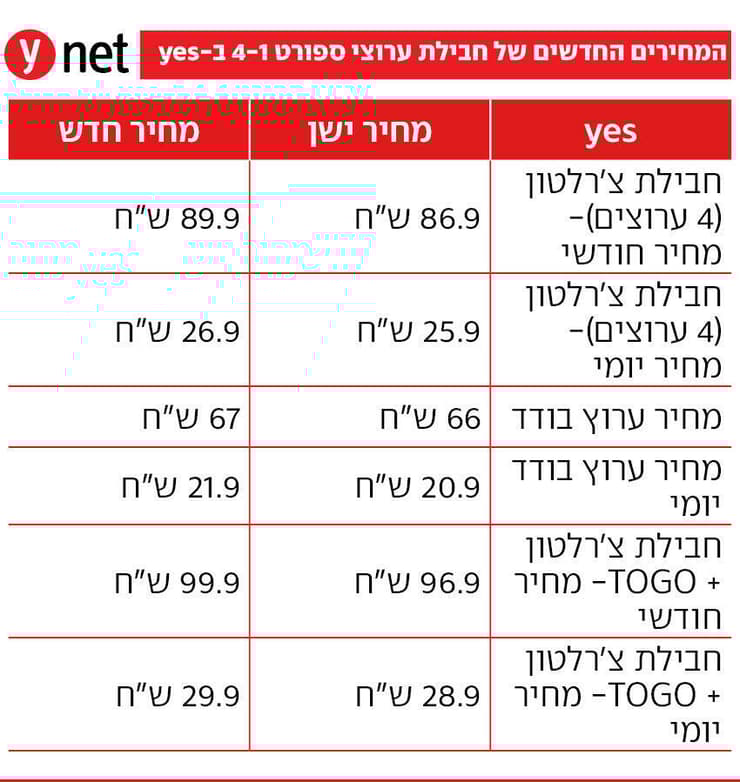מ-yes נמסר בתגובה: "עדכון המחיר בערוצי הספורט של צ'רלטון נע בסכום של 6-1 שקלים לחודש בלבד והינו על רקע התייקרויות מתמשכות ומשמעותיות במחירי זכויות שידורי הספורט בארץ ובעולם".