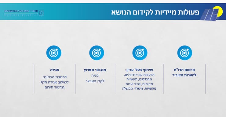 משרד האנרגיה גם מתכוון לחלק תמריצים למעבר למשאבות חום ופאנלים סולאריים בבתים ובניינים קיימים. מדינות רבות ב-OECD כבר עושות את זה והמשרד כבר הגיש בקשה פורמלית לקרן העושר לסיוע במעבר הזה. המעבר הדרמטי הזה גם דורש להכשיר את השוק להתקנת משאבות חום ולהנגיש מידע לציבור. יש פה היבטים טכנולוגיים הנדסיים מורכבים.