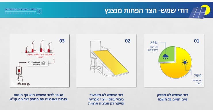 אם לא היו דודי השמש - הייתה תוספת של עוד 5% לתצרוכת החשמל הארצית - היו נדרשים עוד 3,000 גיגואט של הספק סולארי כדי לאזן את זה - כמעט 40% מההספק הסולארי שיש לנו היום.