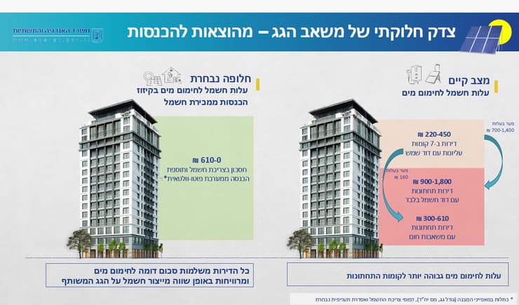 הקמת פאנלים סולאריים ומשאבות חום תייקר את יחידת הדיור ב-4,200 עד 4,500 שקל לפי הערכות משרד האנרגיה, אבל לפי המשרד ההחזר השנתי אל מול המצב הקיים היום, צפוי להיות בין 660 ל-1,480 שקל בשנה (תלוי בכמות צריכת מים חמים) שמשק הבית יחסוך על תשלום חשמל לחימום המים ובנוסף, הוא ירוויח מייצור חשמל על הגג שלו.