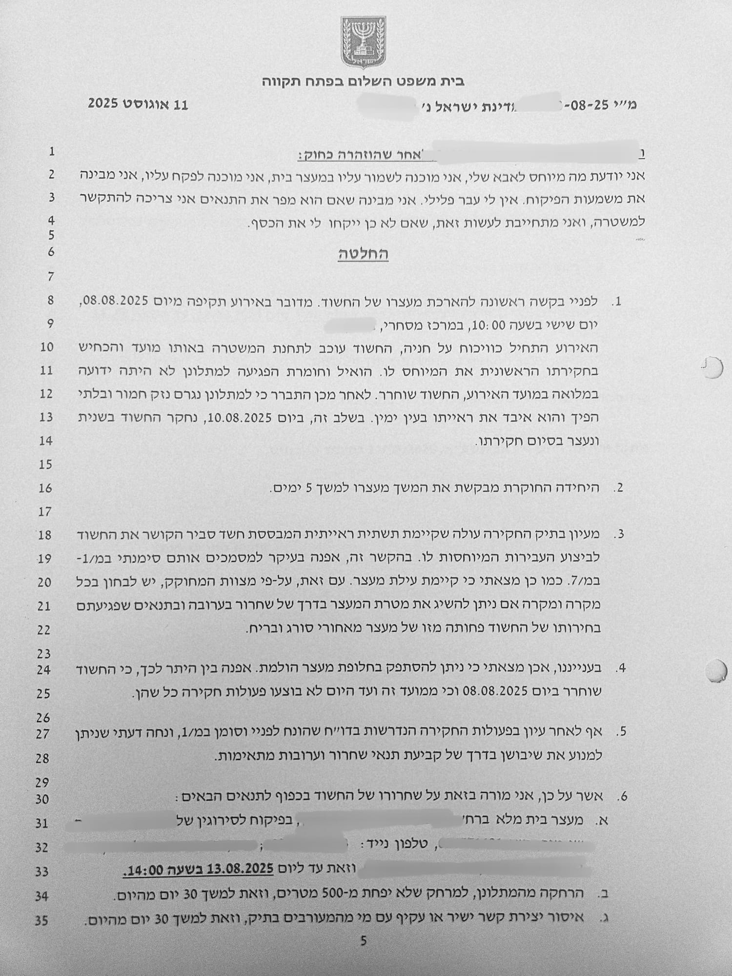 בסופו של דבר, אחרי שאשתו ובתו הצהירו שהן מוכנות לשמור עליו במעצר בית, דחתה השופטת חמו את הבקשה להארכת מעצר. "מצאתי כי ניתן להסתפק בחלופת מעצר הולמת", כתבה.