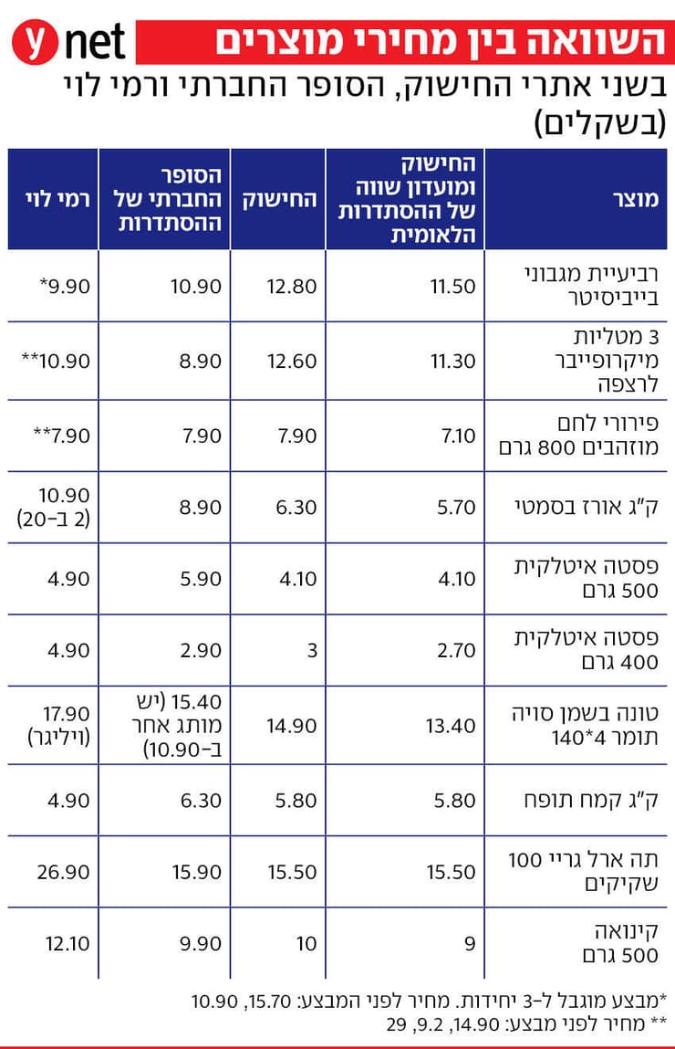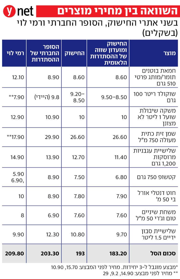 סל באתר החישוק-מועדון שווה של ההסתדרות הלאומית, זול בכמעט 10 שקלים מאותו הסל באתר החישוק, פער של כ-5%. הוא זול גם מהסופר החברתי של ההסתדרות: פער של כ-11% ומרמי לוי – פער של כ-14%.