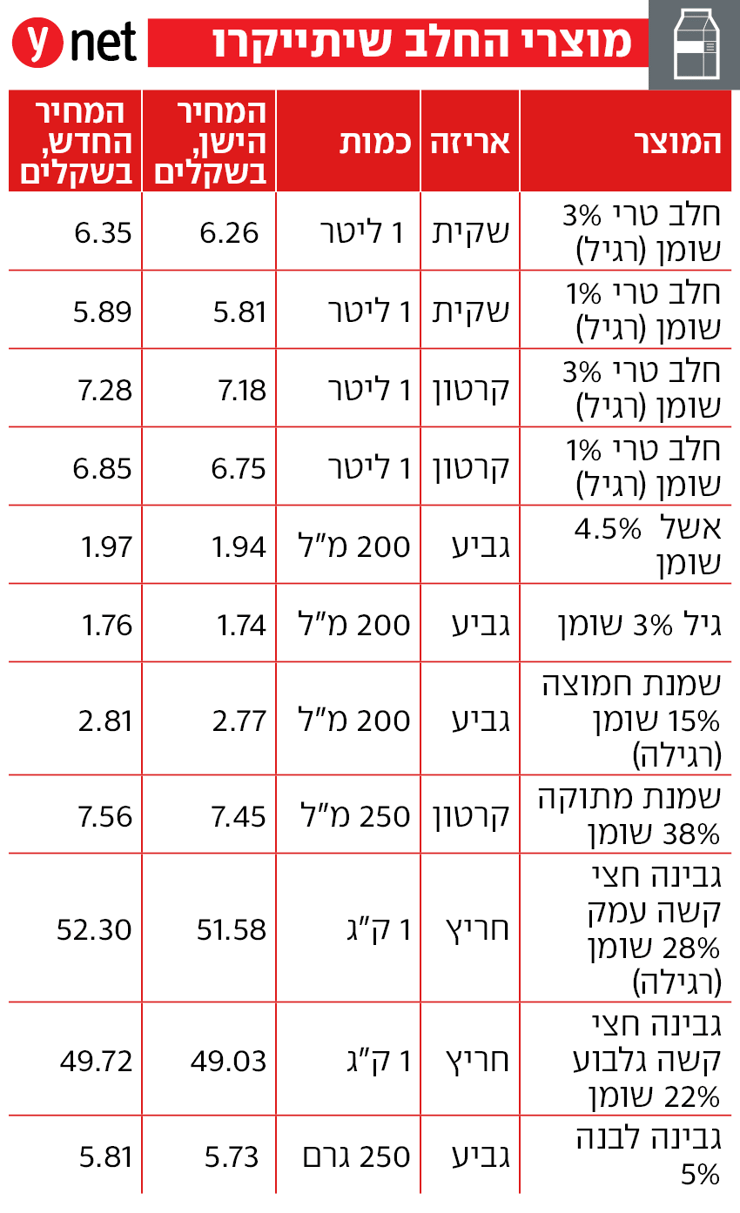 גם מחיר אשל 4.5% בגביע (200 מ"ל) יעלה מ-1.94 שקל ל-1.97 שקל, גבינה צהובה עמק (28%) 1 ק"ג מ-51.58 ל-52.3 שקל וגבינה לבנה 5% בגביע (250 גרם) מ-5.73 ל-5.81 שקל.
