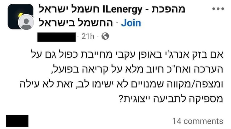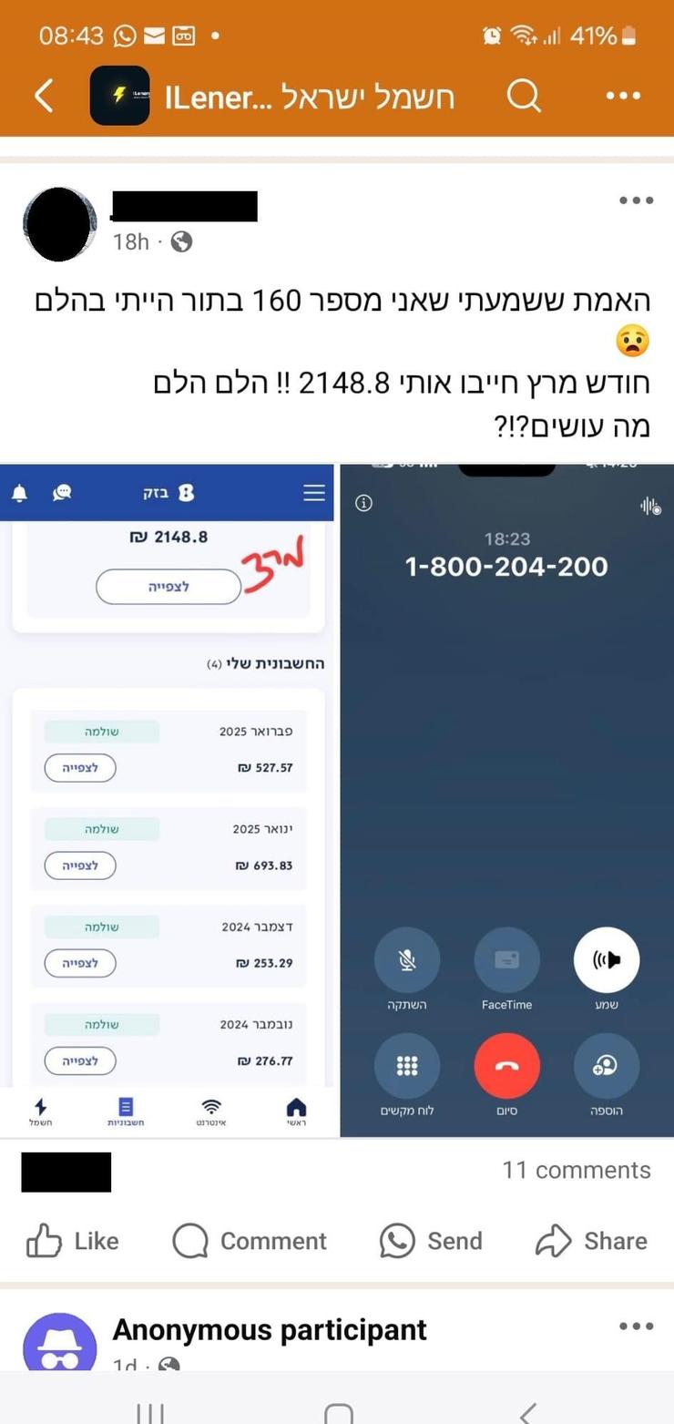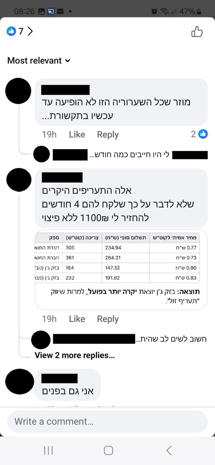לקוח בשם אדיר מספר שקיבל חיוב על פברואר של 2,500 שקל וטענו מולו שמדובר ב"תיקון צריכה". לקוח בשם לוטם כתב: "גם אצלי המחיר עולה מחודש לחודש. בחודש האחרון ביקשו 1,200 שקל בערך. מעולם לא שילמתי יותר מ-300 שקל לחודשיים לפני כן".