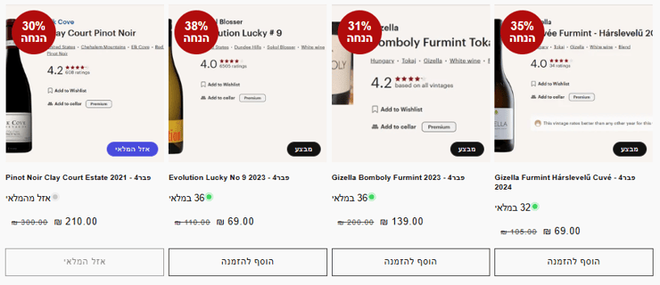 ההיצע משתנה מפרויקט לפרויקט וכולל יינות, ויסקי, רום, בירה, שמפניה ועוד. כך, למשל, במהלך ינואר הוצעו למכירה יינות של יקב מדרום איטליה בהנחות של 38%-48%, לצד ויסקי ברמות מחיר שונות בהנחות עמוקות במיוחד. בתחילת החודש, למשל, יצא פרויקט "חיסול מחסן סיטונאי" - בירות, יין, קוקטיילים ועוד.