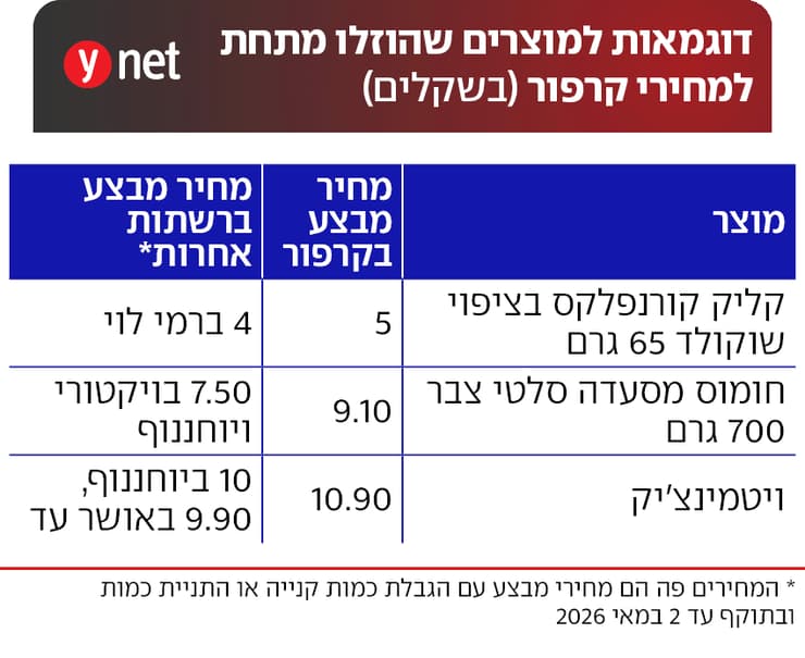 אצל כל הרשתות האלה, המחיר השווה למחיר קרפור הוא מחיר מבצע עד 2 במאי, כשאצל קרפור הוא תקף עד 12 באוקטובר, עם הגבלה ל-2 יחידות. הבדיקה נערכה עבור שופרסל דיל, יוניברס, ויקטורי, רמי לוי, אושר עד ויוחננוף.