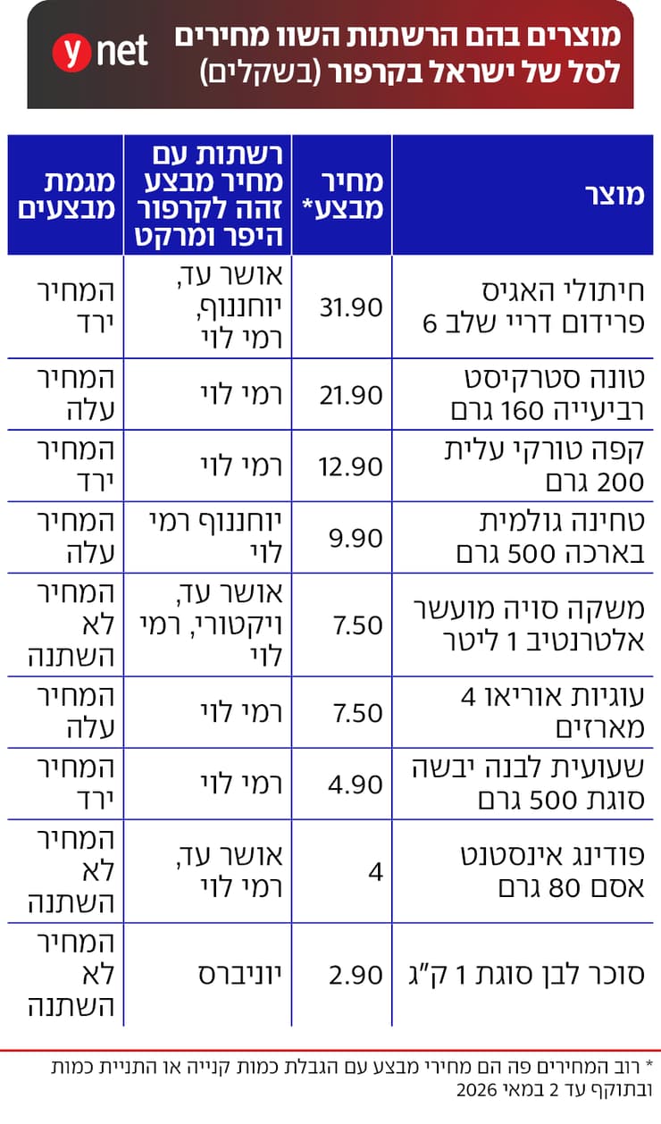 פודינג אינסטנט וניל אסם 80 גרם נמכר בקרפור היפר ומרקט וגם באושר עד וברמי לוי ב-4 שקלים. בשתי האחרונות מדובר במבצע של 3 ב-12. מחיר המבצע הזה ניתן ברמי לוי גם לפני הסל של ישראל. רוטב עגבניות מרוכז פריניר 100 גרם נמכר בקרפור היפר ומרקט וכעת גם ברמי לוי ב-1.50 שקלים. בעוד שבקרפור המגבלה היא לשתי יחידות, ברמי לוי המבצע יותר הגיוני מבחינת צריכה: 4 יחידות ב-6 שקלים מוגבל לשני מימושים.