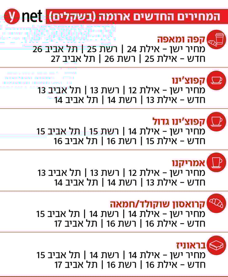 קפה ומאפה יתייקרו מ-24 שקל באילת, 25 שקל בכלל הארץ ו-26 שקל בת"א ל-25, 26 ו-27 שקל בהתאמה. גם לאחר עדכון המחירים, מוצרי הקפה בארומה ישראל נמכרים במחירים נמוכים לעומת המתחרים. מהרשת נמסר שניתן להוריד את המחיר ב-10% לרוכשים באמצעות "ארומה קרדיט" באפליקציה.